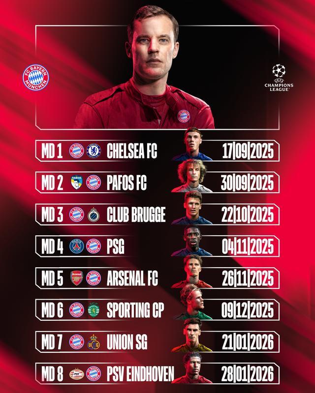 拜仁歐冠賽程:首戰(zhàn)切爾西,11月戰(zhàn)巴黎阿森納