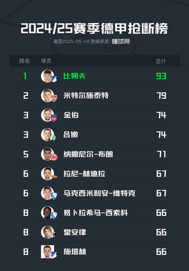 2024-25德甲斷球榜:比朔夫領(lǐng)跑,93次斷層優(yōu)勢