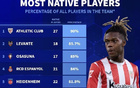 德列五大聯(lián)賽本土球員占比高:畢包第一,巴薩靠前