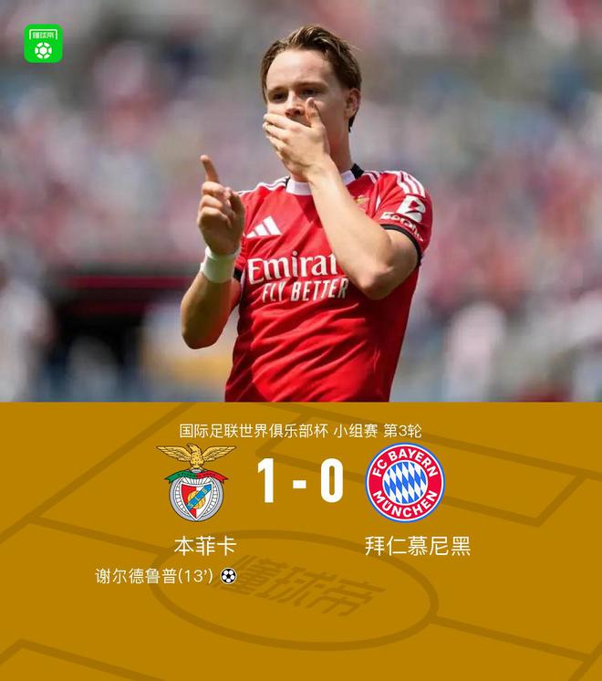 本菲卡勝拜仁,小組頭名出線,謝爾德魯普進球,薩內錯失良機。
