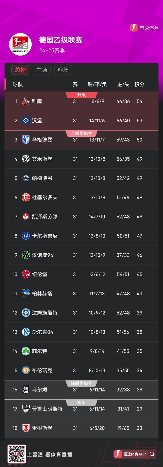 德乙28輪后,漢堡52分領跑,馬格德堡落后6分,升級形勢佳。