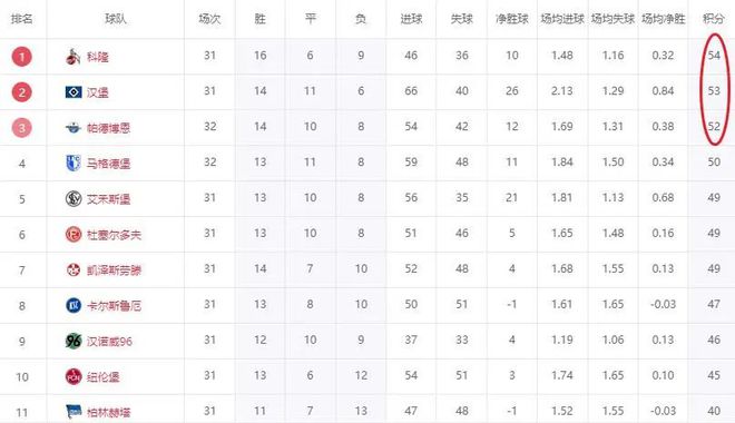 德乙第31輪集體平局,前六名無勝績,科隆漢堡居前二。
