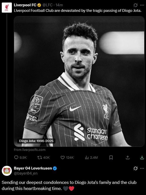 勒庫(kù)森哀悼若塔,向其家人及利物浦致哀。